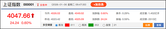 截至9点47分,上证指数报4047.66点,较前一交易日上涨24.24点,涨幅为0.60%。