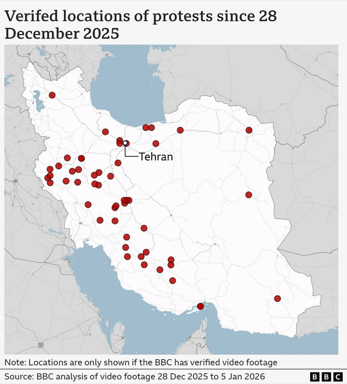 BBC统计的伊朗发生抗议示威的地点 BBC