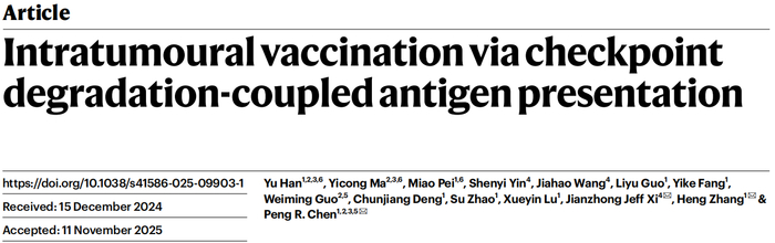 北京大学新闻网1月8日消息,2026年1月8日,北京大学化学与分子工程学院/深圳湾实验室陈鹏团队联合未来技术学院席建忠团队在《自然》(Nature)上发表了题为“Intratumoural vaccination via checkpoint degradation-coupled antigen presentation”的研究论文。