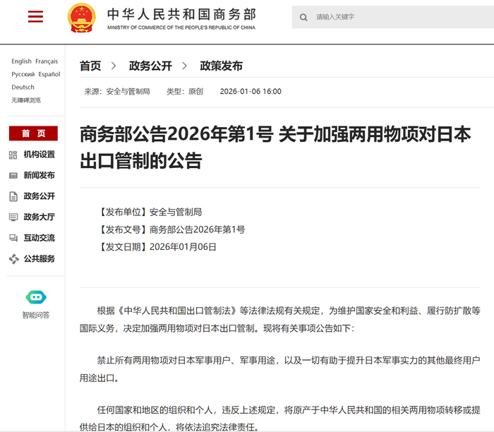 2026年1月6日,商务部发布了第1号通告: