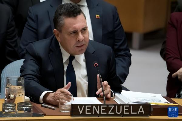 1月5日,委内瑞拉常驻联合国代表萨穆埃尔·蒙卡达在位于纽约的联合国总部举行的安理会委内瑞拉局势紧急会议上发言 新华社