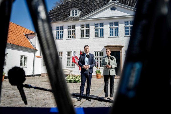 2025年4月27日,丹麦孔根斯林比,丹麦首相弗雷德里克森(右)与格陵兰岛自治政府总理尼尔森接受采访。视觉中国