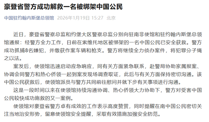 据悉,南非豪登省警察总监和约堡大区警察总监近日分别向驻南非使馆和驻约翰内斯堡总领馆通报:经警方全力工作,日前在索维托地区被绑架的一名中国公民已安全获救。警方成功抓捕8名嫌犯,并缴获作案车辆和枪支。警方将继续全力侦办案件,将犯罪分子绳之以法。