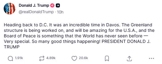 “正返回华盛顿,达沃斯时间精彩绝伦,”特朗普美东时间下午13点35分发帖,自我肯定,“格陵兰框架正在推进,将对美国非常棒,‘和平委员会’是世界前所未见的东西——非常特别。太多好事在发生!”