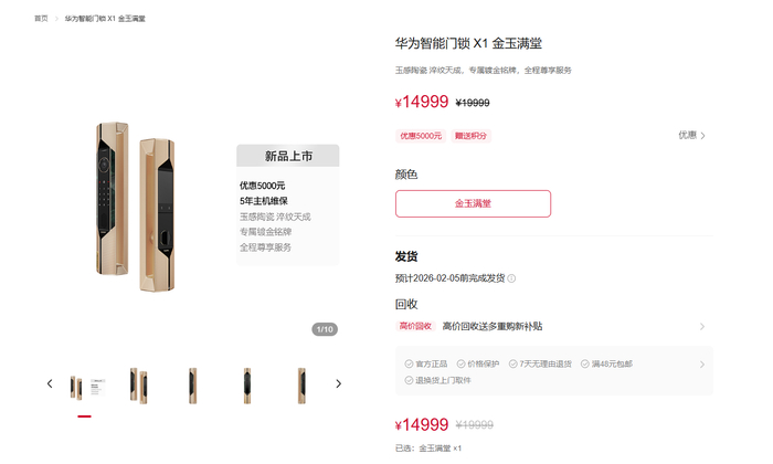 近期,华为商城上架了一款定价高达19999元的智能门锁X1“金玉满堂”版。1月23日,观察者网查询发现,目前该产品享有5000元的优惠,降至14999元。有消息称,该产品上架之初曾出现“暂时缺货”的现象。不过该产品最新显示为有货状态,但下单后预计2月5日前发货。