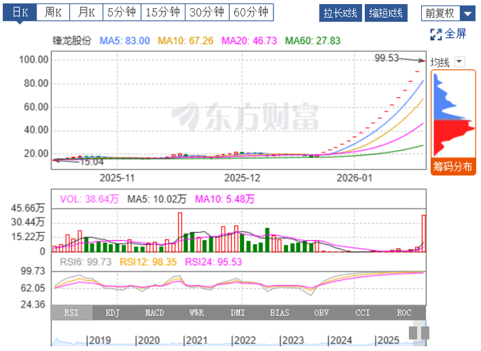1月23日,锋龙股份再度涨停,斩获十八连板,股价触及99.53元/股。与此前不同的是,锋龙股份今日放出巨量,早盘成交金额高达37.88亿元,此前其成交金额长期徘徊在1亿元以下,最高不超过5亿元。