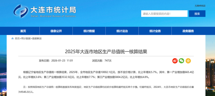 1月23日,大连市统计局公布:根据辽宁省地区生产总值统一核算结果,2025年,全市地区生产总值10002.1亿元,按不变价格计算,比上年增长5.7%。其中,第一产业增加值665.4亿元,比上年增长3.6%;第二产业增加值3532.5亿元,比上年增长7.7%;第三产业增加值5804.2亿元,比上年增长4.8%。