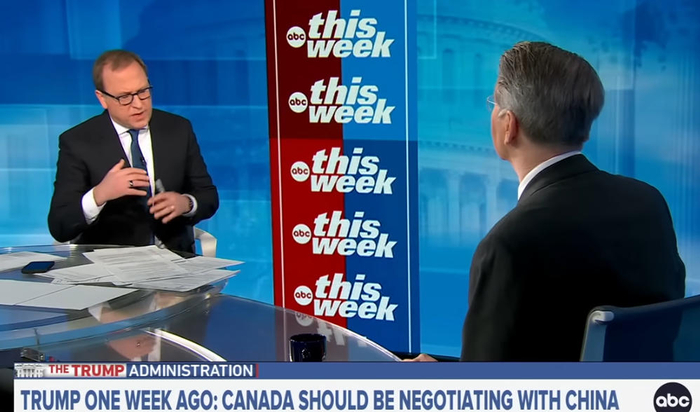 在美国广播公司(ABC)25日的《本周》节目中,在回应特朗普为何再次以贸易战威胁加拿大时,贝森特称,“美国与加拿大拥有高度一体化的市场,商品在生产过程中可能会跨越边境达六次之多,我们绝不能让加拿大成为中国向美国倾销廉价商品的突破口。”