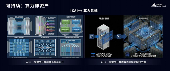 天数智芯打造的AI++算力系统新范式,统一芯片内与芯片外构建算力系统,建立软件驱动算力系统的全新模式,以底层库为基石,以模型与计算中间层为支柱,用软件的智慧,释放硬件的潜能,支撑上层不断繁荣的应用生态。