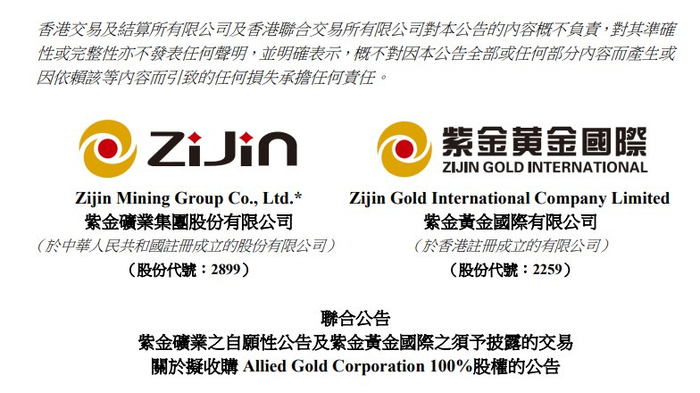 1月26日晚,紫金矿业发布公告称,旗下公司紫金黄金国际计划以44加元每股的价格收购加拿大Allied Gold Corporation(联合黄金)全部已发行的普通股,收购对价共计约55亿加元,约合人民币280亿元。