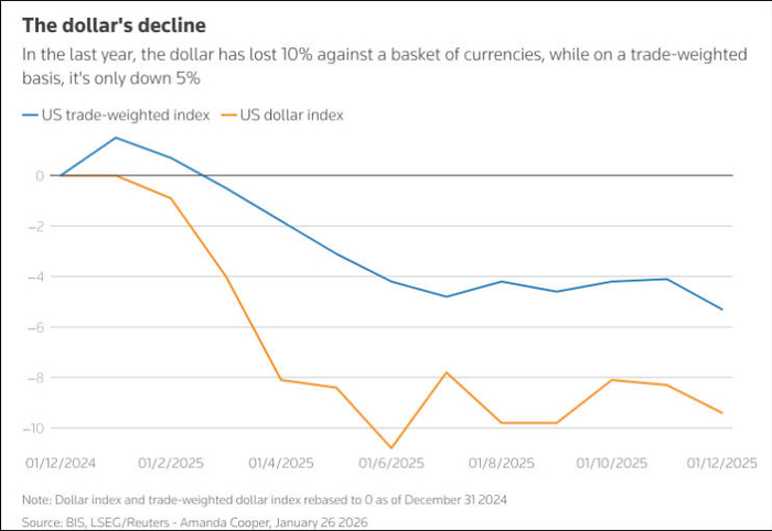 路透社报道指出,2026年开年几周市场动荡,美元再度承压,包括美国政府希望美元走弱等诸多因素,促使投资者重新审视此前对美元将保持一段时期稳定的乐观预期。