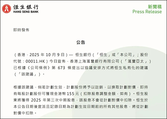 故事的开端,在2025年10月9日——国庆假期刚结束,汇丰和恒生就联合抛出了一个重磅公告:汇丰计划以每股155港元的现金,收购恒生银行剩余所有股份,彻底将其私有化。这个价格,说出来就让人眼前一亮:比公告前一天恒生的收盘价119港元高了30.3%,比过去30天的平均股价高了33.1%,就算和过去一年的平均股价比,也高了近五成。