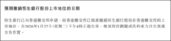 2026年1月27日下午4点,香港交易所的电子屏上,一个陪伴了市场53年的名字——恒生银行,正式从上市名单中移除。这一刻,不仅标志着这家诞生于1933年的“香港老牌华资银行”告别公众视野,更意味着一场耗资1061亿港元、由汇丰集团主导的“千亿收编”尘埃落定。