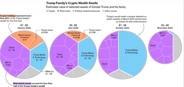 特朗普家族的财富构成,虚拟货币占的比重快速、显著增加。特朗普通过总统的影响力,凭空给他的家族媒体产业和虚拟货币产业创造了26亿美元的价值。