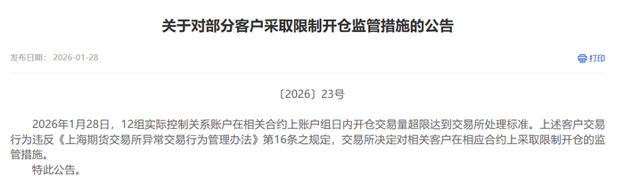 此外,上海期货交易所还发布通知称,2026年1月28日,12组实际控制关系账户在相关合约上账户组日内开仓交易量超限达到交易所处理标准。上述客户交易行为违反《上海期货交易所异常交易行为管理办法》第16条之规定,交易所决定对相关客户在相应合约上采取限制开仓的监管措施。
