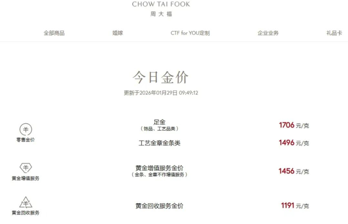 受此影响,国内各品牌金饰价格也一路走高。例如周生生报价1708元/克,上涨94元/克;周大福报价1706元/克,上涨88元/克;老庙黄金报价1722元/克,上涨104元/克;老凤祥为1713元/克,上涨93元/克。