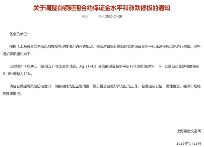 1月28日,上海黄金交易所发布通知,根据《上海黄金交易所风险控制管理办法》的有关规定,我所对白银延期合约交易保证金水平和涨跌停板比例进行调整。现将相关事项通知如下:自2026年1月30日(星期五)收盘清算时起,Ag(T+D)合约的保证金水平从19%调整为20%,下一交易日起涨跌幅度限制从18%调整为19%。
