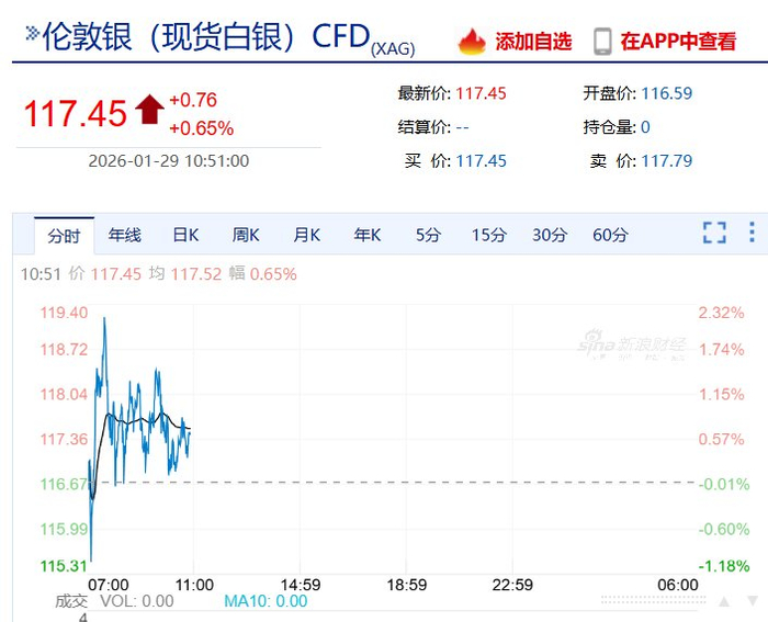 与黄金类似的,白银价格也在近期持续猛涨。截至北京时间29日上午10时,伦敦现货白银价格突破117美元/盎司,较昨日价格上涨约0.65%。