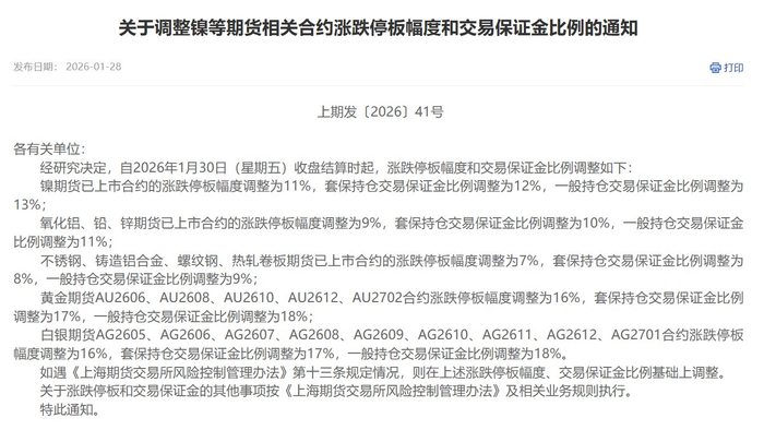 同日,上海期货交易所也发布通知称,自2026年1月30日(星期五)收盘结算时起,对部分类型期货的涨跌停板幅度和交易保证金比例进行调整。