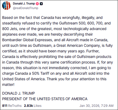 特朗普在“真实社交”称,“鉴于加拿大长期以来非法且顽固地拒绝为湾流(Gulfstream)500、600、700及800系列机型提供认证,美方今日正式宣布采取反制措施。即日起,美方将撤销对加拿大庞巴迪环球快车(Bombardier Global Express)及所有加拿大制造飞机的认证。”