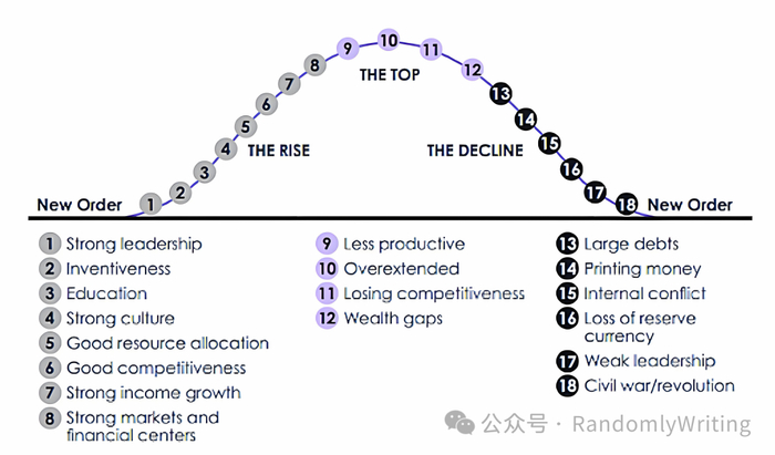 文章大量引用他2021年出版的《Principles for Dealing With the Changing World Order》(中译本《原则:应对变化中的世界秩序》)中的分析,这本书基于500年大国兴衰历史总结出六个阶段的周期模型。
