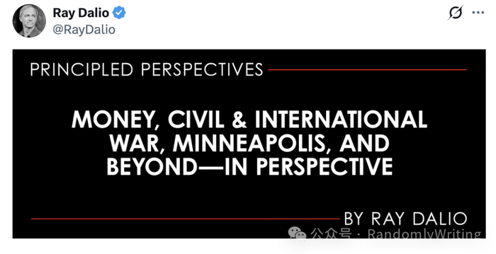 微信公众号“RandomlyWriting”对达利欧最新发布的文章《Money, Civil & International War, Minneapolis, and Beyond—in Perspective》进行全文翻译。观察者网转载此文,供读者参考,文章仅代表作者本人观点。