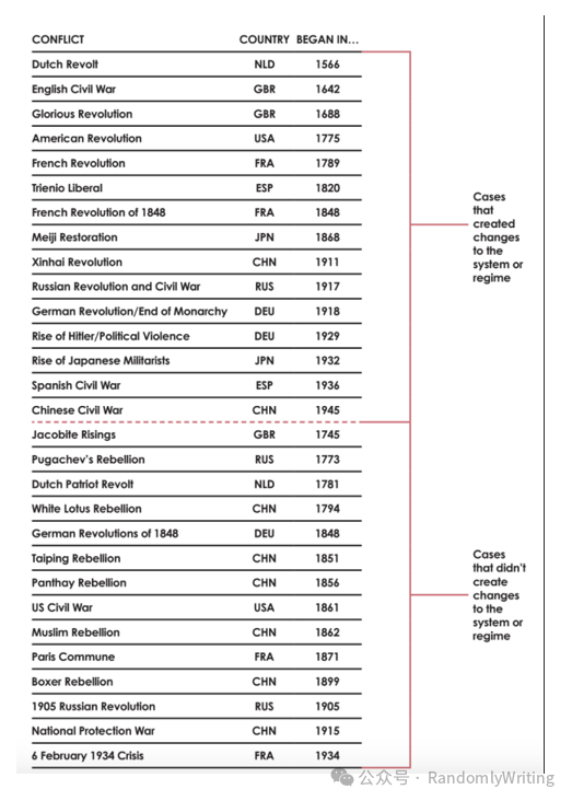 我将这些例子分为两类:一类是导致系统/政权发生重大变化的,另一类是没有导致系统/政权发生重大变化的。例如,美国内战是一场极其血腥的内战,但它未能推翻现有的制度/秩序,因此它属于表格底部的第二类;而那些推翻了现有制度/秩序的内战则位于表格顶部。