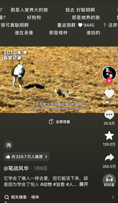 《重返·狼群》翻红的起因是短视频博主@笔战风华 1月8日发布了20分钟的《重返·狼群》解说视频,选取了格林牵马救人、归还红腰带等动人故事,用细腻的旁白和有感染力的配乐,重新讲述了这段人类与野狼跨越物种的亲情。截至1月31日,该视频点赞超1015万。