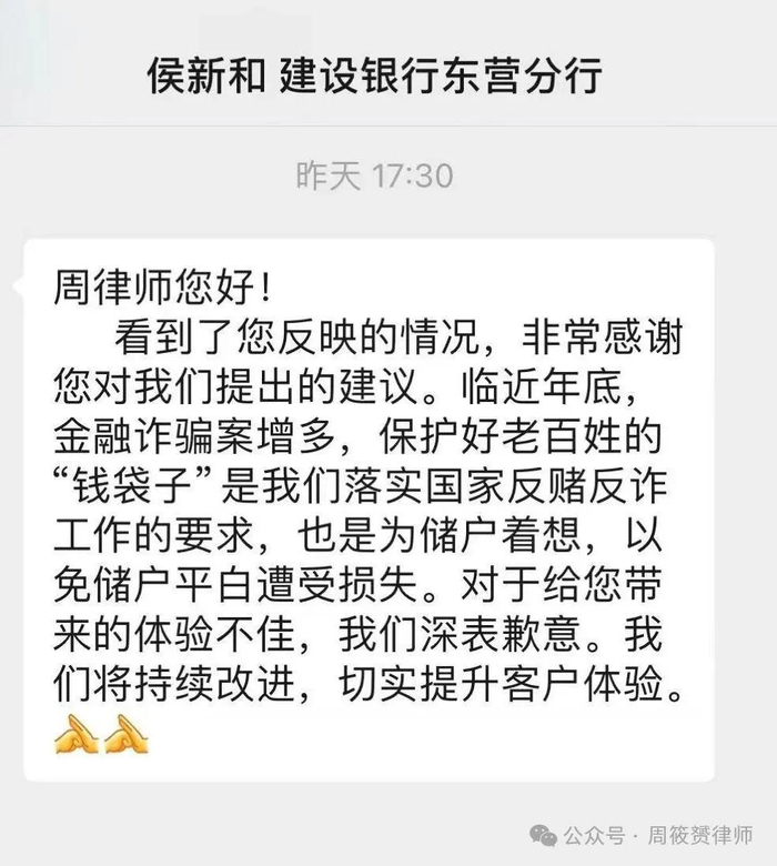 2025年11月,事件登上热搜后次日,建设银行东营分行副行长侯新和发信息向周筱赟道歉,但被拒绝。