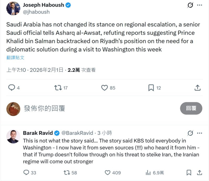 值得一提的是,在《中东报》刊文反驳美媒报道后,沙特媒体阿拉伯卫星电视台(Al Arabiya)驻华盛顿记者约瑟夫·哈布斯(Joseph Haboush)转发了有关内容。但很快,Axios报道的作者之一巴拉克·拉维德(Barak Ravid)在帖文下留言,强调他从7个消息来源处确认哈立德发表过有关言论。