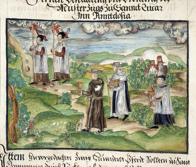 1560年至1632年,西班牙安达卢西亚圣卢卡尔,神父和僧侣们手持旗帜、圣杯、礼拜书和圣体光,为前往委内瑞拉的探险做准备。此图出自《纽伦堡科勒家族回忆录、传记笔记和诗歌等》。