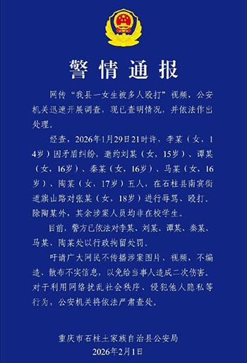 经查,2026年1月29日21时许,李某(女,14岁)因矛盾纠纷,邀约刘某(女,15岁)、谭某(女,16岁)、秦某(女,16岁)、马某(女,16岁)、陶某(女,17岁)五人,在石柱县南宾街道旗山路对张某(女,18岁)进行辱骂、殴打。除陶某外,其余涉案人员均非在校学生。