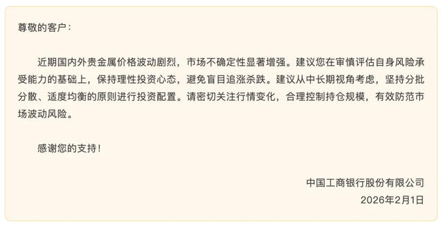 作为国有大行的代表,工商银行率先发力,于2月1日通过公司贵金属业务部“工银金行家”公众号发布风险提示,明确指出近期国内外贵金属价格波动剧烈,市场不确定性显著增强,建议客户在审慎评估自身风险承受能力的基础上,保持理性投资心态,坚决避免盲目追涨杀跌的非理性操作。