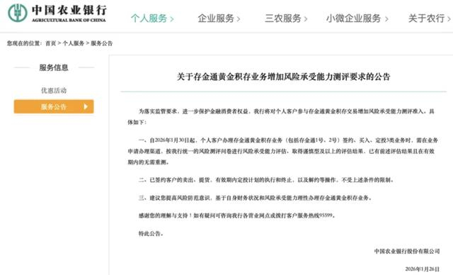 此前的1月26日,农业银行已发布公告,强化投资者适当性管理,明确自1月30日起,个人客户办理存金通黄金积存业务(包括存金通1号、2号)的签约、买入、定投三类业务时,需在业务申请办理渠道,按农行统一的风险测评问卷完成风险承受能力评估,且需取得谨慎型及以上的评估结果方可办理相关业务,从源头筛选具备相应风险承受能力的投资者,引导投资者理性参与。
