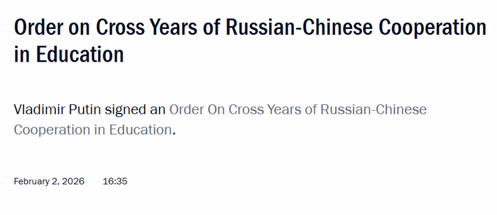 据央视新闻消息,当地时间2月2日,俄罗斯总统普京正式签署命令,定于2026年至2027年举办“中俄教育年”。