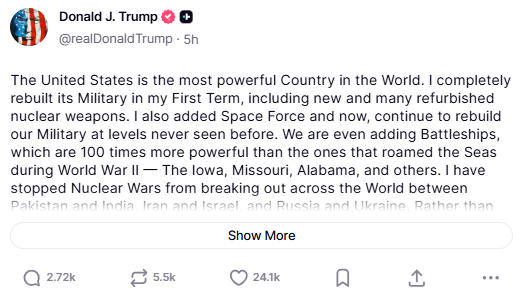 特朗普5日曾在社交媒体发帖称,美俄不应继续执行《条约》的某些条款,而应制定一项新的协议。他将《条约》称作美国此前谈判达成的“糟糕协议”。