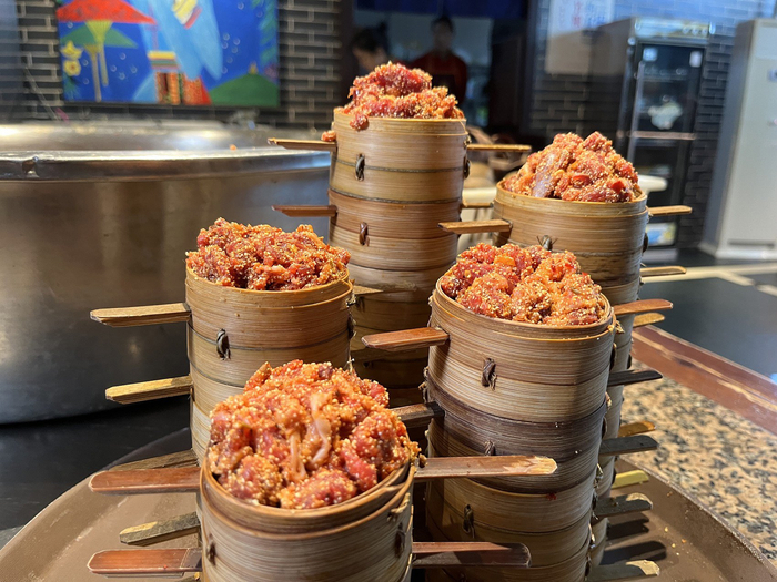 即将蒸制的羊肉格格。袁城霖/摄与羊肉格格一样,寻味团品尝的吊锅蜀宣花牛牛排来自达州市宣汉县。