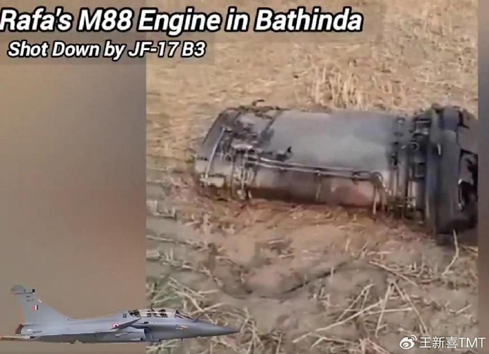 印度网友在印度巴特恩达空军基地也拍摄到“阵风”战机残骸,包括发动机部分,画面显示,这个发动机残骸正是配备在“阵风”战机上的“斯奈克玛”M88涡扇发动机。