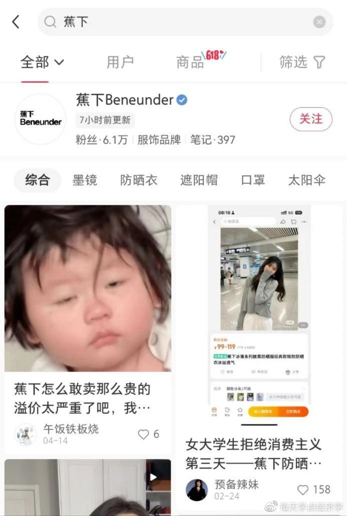 小红书上,蕉下关联的综合热帖下总是少不了有关“贵”“智商税”“消费主义”的指责: