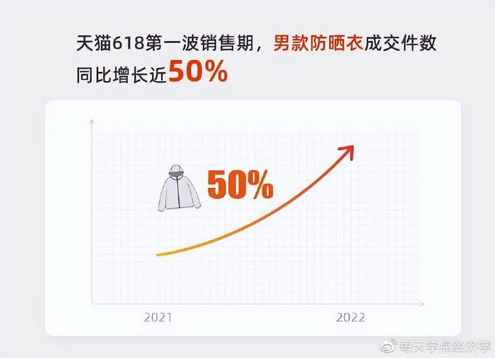 去年天猫618期间,男款防晒衣的商品供给和加购显著增长,成为户外服饰中销售最火的商品,成交件数同比增长近50%。