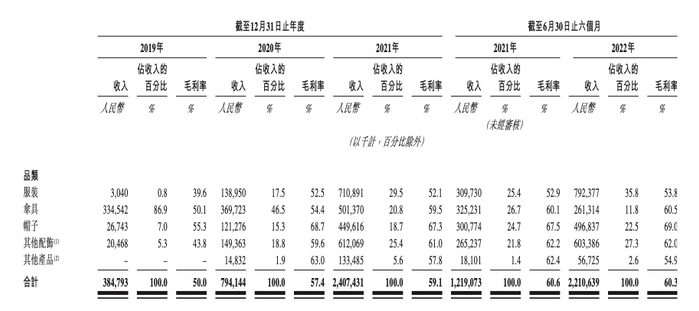 2019年蕉下39.6%的服装毛利率已经不低了,2022年,服装毛利率已经上涨到53.8%了,综合所有产品品类看,毛利率更是达到了60.3%。