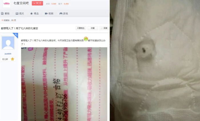 2016年3月14日,七度空间贴吧,ID为“juuebdn”的网友曝料自己用了七八年的七度空间,然后发现了卫生巾有黑东西,都不知道该怎么办了。