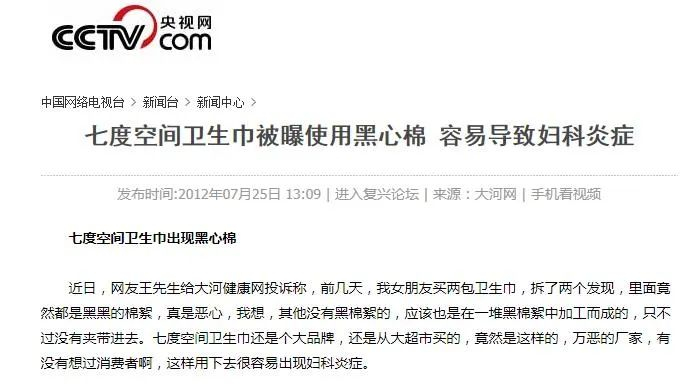 2012年,央视网援引大河网报道,收到网友投诉:“我女朋友买两包卫生巾,拆了两个发现,里面竟然都是黑黑的棉絮,真是恶心,我想,其他没有黑棉絮的,应该也是在一堆黑棉絮中加工而成的,只不过没有夹带进去。七度空间卫生巾还是个大品牌,还是从大超市买的,竟然是这样的,万恶的厂家,有没有想过消费者啊,这样用下去很容易出现妇科炎症”。
