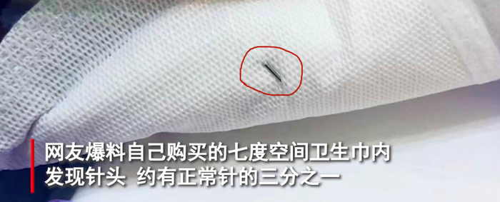 2021年6月5日晚,江西鹰潭的唐女士通过媒体爆料“自己购买的七度空间卫生巾内发现针头,吓一大跳,还好发现及时,不然一屁股坐下去,后果不堪设想”。