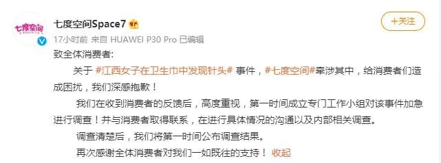 8,七度空间深夜致歉:已加急调查卫生巾针头事件—北京日报