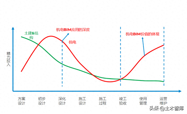 建筑全生命周期中,土建和结构专业的主要精力,是放在方案设计和初步设计阶段,随着时间推移,精力投入越来越少;而机电专业的主要精力,除了放在初步设计和深化设计阶段之外,在竣工验收后期,有一个显著的精力投入提升。