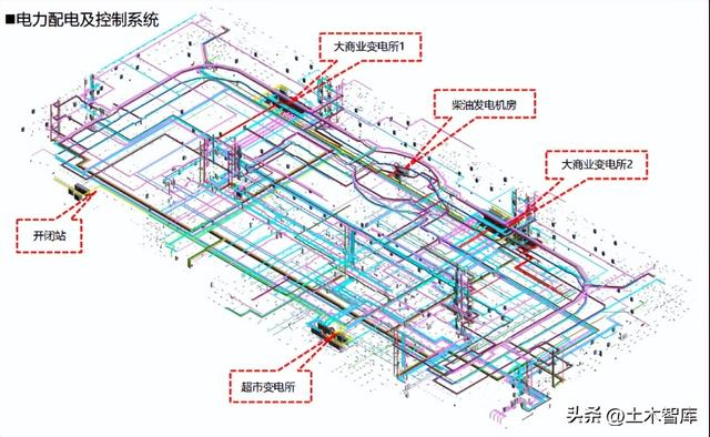 BIM管综图最后,电气专业应用。根据设计图纸对桥架尺寸路由点位进行建模,从整体设计说明可以了解建筑的区域划分、功能布置、变电所、配电房等内容;从原理流程图了解各级电箱的控制区域及线路单元等内容。