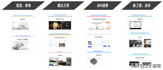 我梳理了目前在建筑业相关的十款AI工具,已经布局分布在建筑流程的前、中、后期——规划。拿地阶段有DELVE、Giraffe;