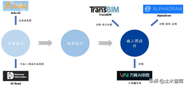 专注投前方案设计的小库科技、聚焦施工图设计智能化的品览科技、提供施工图智能生成服务的TransBIM(第三维度科技)、做云渲染的Arko AI、专注审图的万翼科技等。