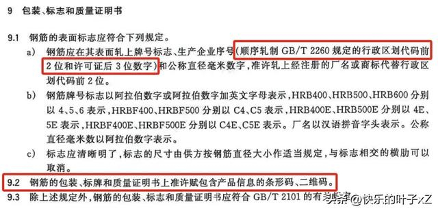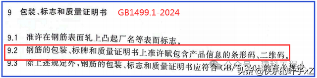 9.更改了包装、标志和质量证明书的规定,增加了“钢筋的包装、标牌和质量证明书上准许赋包含产品信息的条形码、二维码。”
